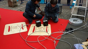 Das der Stromanschluß nicht einfach wird hatten wir vermutet, dass es aber so kompliziert werden kann, damit war nicht zu rechnen. Nach mehrstündigen Versuchen der japanischen Elektriker, die Pyramide zum Leuchten und Drehen zu bringen, erstrahlt sie am Abend in ihrer vollen Pracht und dreht sich.