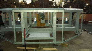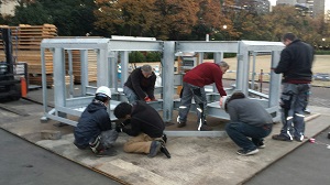 Gemeinsam mit den japanischen Monteuren wird das Stahlgestell montiert.